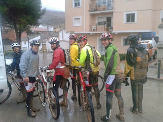 Descargamos las bicis, nos enfundamos chaquetas, chubasqueros y demás atavíos, y con cara seria nos ponemos en marcha. Nadie se ha atrevido siquiera a mencionar la posibilidad de hacer tiempo, con un cafecito entre las manos, hasta ver si escampa.