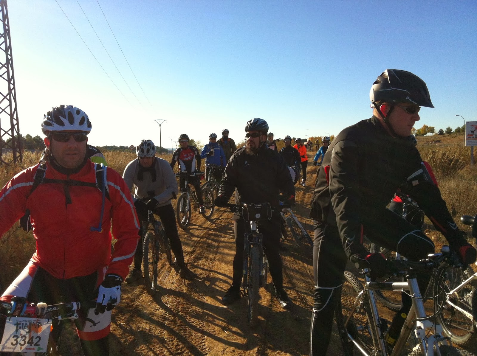 Desde ahí vamos a Daganzo, al que atravesamos en dirección a Ajalvir, para unirnos al grupo que había quedado reparando el pinchazo, donde volvemos a ver otros «tramperos» con red. Pero esta vez el Seprona, se encuentra a escasos 50 metros, con lo cual deducimos que este tipo de caza es legal, o los del Seprona tienen una vista muy «gorda», en ese momento somos adelantados por un todo terreno, que parece que fuera a apagar un incendio, no un incendio no, llegaba tarde a una parrillada que tenían preparada unos cazadores,en la cuneta del camino, y es que el tercer tiempo se esta extendiendo, sin remedio, al llegar a su altura nos ofrecen el avituallamiento, el cual rechazamos cortésmente, pues ya sabemos que después de tomar unas pancetas con unos vinitos, no es que no sea recomendable circular, si no que es muy, muy difícil dar pedales. Pasado Ajalvir toca otra vez subir dejando a la izquierda el cementerio de esta localidad, la subida la hacemos en grupo, la anécdota del día fue encontrarnos con el rodaje de una película donde uno de los actores era Santi Millán, gran aficionado al MTB (ha finalizado la Titán Desert de 2013), la actriz muy guapa ella no supimos quien era, no pudimos hablar con ellos debido a que estaban en pleno rodaje.